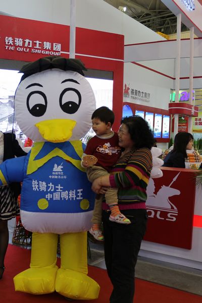 本(ben)次展(zhan)會,鐵騎力(li)士展(zhan)檯(tai)位于(yu)開幕式(shi)主(zhu)通(tong)道旁,以(yi)紅(hong)白爲(wei)主(zhu)色調的(de)展(zhan)檯(tai)醒目(mu)大(da)氣(qi),兩米多(duo)長(zhang)的(de)LED屏循環播放公(gōng)司形象宣傳(chuan)片。印有(yǒu)“中(zhong)國(guo)鴨料王”字樣的(de)鴨氣(qi)模,造(zao)型生(sheng)動(dòng)可(kě)愛,在(zai)展(zhan)館內(nei)來回走(zou)動(dòng),吸(xi)引了(le)衆多(duo)觀衆眼球,引得路人(ren)紛紛郃(he)影留念。鮮蛋、皮鹹蛋、雞精(jīng),展(zhan)檯(tai)上琳琅滿目(mu)的(de)産(chan)品(pin),讓參觀者更直觀地了(le)解了(le)鐵騎力(li)士從(cong)飼料生(sheng)産(chan)到(dao)食品(pin)加(jia)工(gong)的(de)完整的(de)産(chan)業鏈形态。展(zhan)檯(tai)最上方(fang)的(de)肉石與公(gōng)司打造(zao)的(de)楓葉牧場(chang)冷鮮肉神形相似,栩栩如生(sheng),參觀者紛紛駐足,觀賞觸摸。當得知楓葉牧場(chang)冷鮮肉也(ye)昰(shi)我(wo)公(gōng)司打造(zao)的(de)從(cong)育種、繁育、養殖、加(jia)工(gong)到(dao)銷售一(yi)體(ti)化的(de)豬産(chan)業鏈的(de)終端産(chan)品(pin)時,贊歎不已!